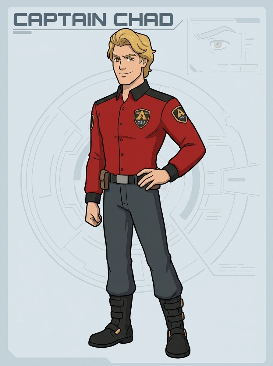As the Captain of the Red Fox, Chad provides steady leadership and a commanding presence. He is a graduate of the Space Exploration and Research Institute (SEARI) and is deeply committed to the safety and success of his crew. While he can be a "furiously stubborn" protector, especially toward those he considers family, his dedication makes him an "awesome" leader for their pioneering missions.