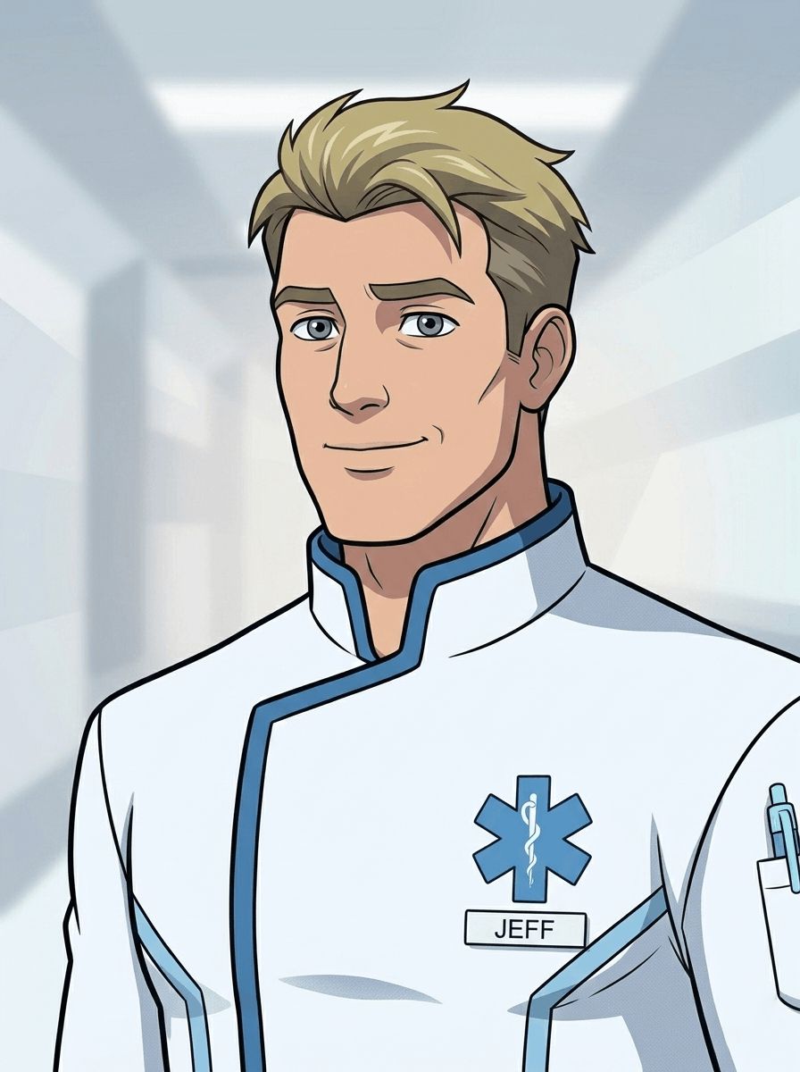 A highly skilled medical professional, Jeff joined the crew during a pivotal shift in the Red Fox’s mission. He is dependable, intelligent, and possesses a "mature" presence that makes him a calming influence in the med lab. While he has a professional obsession with cleanliness, his kind-hearted nature and quick wit allow him to fit right in with the close-knit crew.
